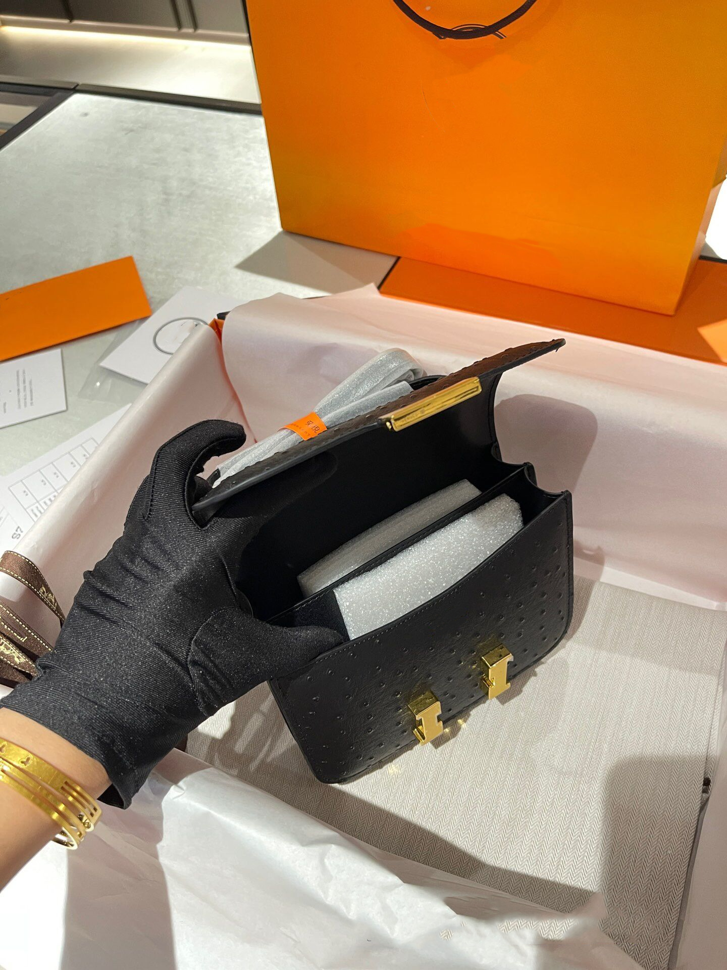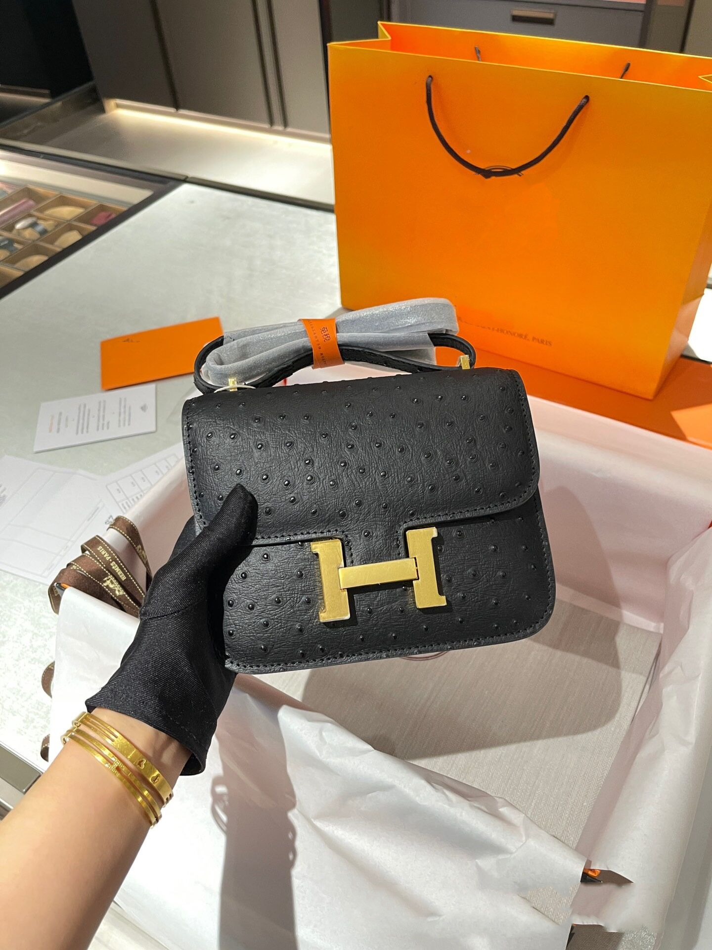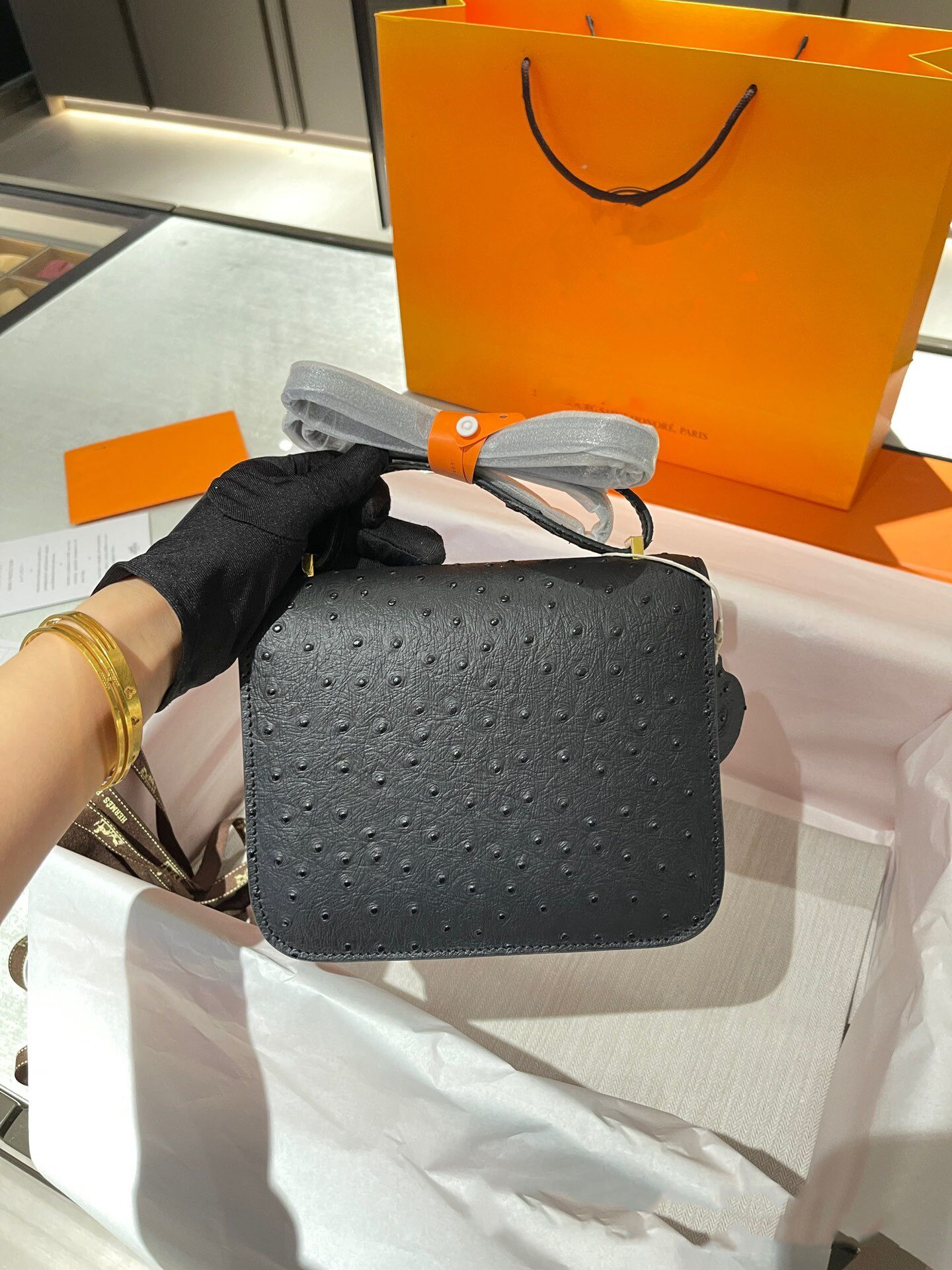 Constance Mini 19 Ostrich skin, gold buckle, one shoulder crossbody bag.